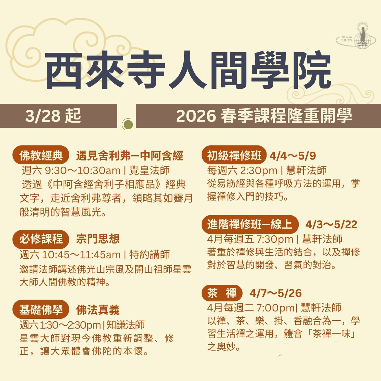 2026 西來寺人間學院【春季班】課程報名