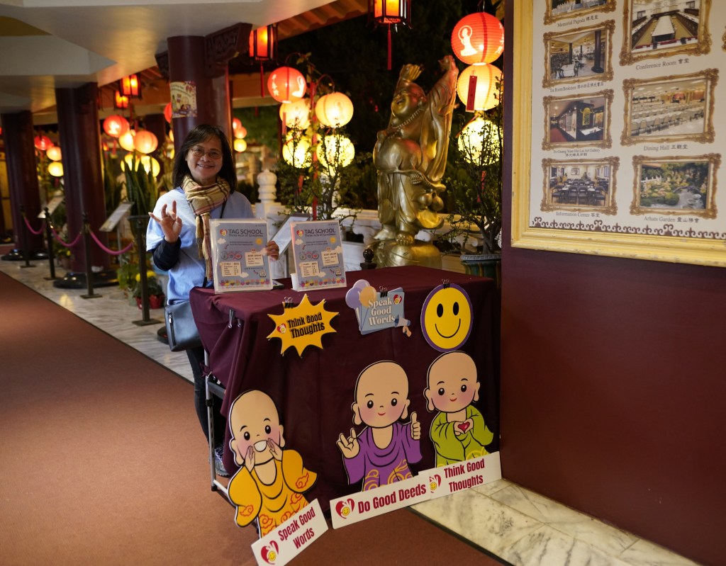 在西來寺新春平安燈會期間,杜美華會長在現場擺設三好學園文宣,用心推廣,令我感動。(潘青霞拍攝)
