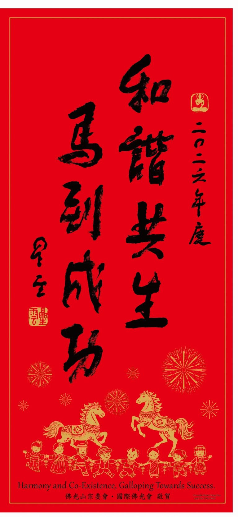“The renewal of all phenomena brings prosperous fortunes, the unity across all endeavors realizes grand vision.” As we enter the Year of the Horse, this year marks the 60th anniversary of Fo Guang Shan as well as the 100th birth anniversary of Venerable Master Hsing Yun, the Founding Master of Fo Guang Shan. On behalf of the global monastic community of Fo Guang Shan, I, Hsin Bau, extend the Venerable Master’s New Year blessing “Harmony and Co-Existence, Galloping Towards Success.” May all enjoy well-being as we share kind intentions for others; and may we walk into a beautiful future with co-existence and co-prosperity.